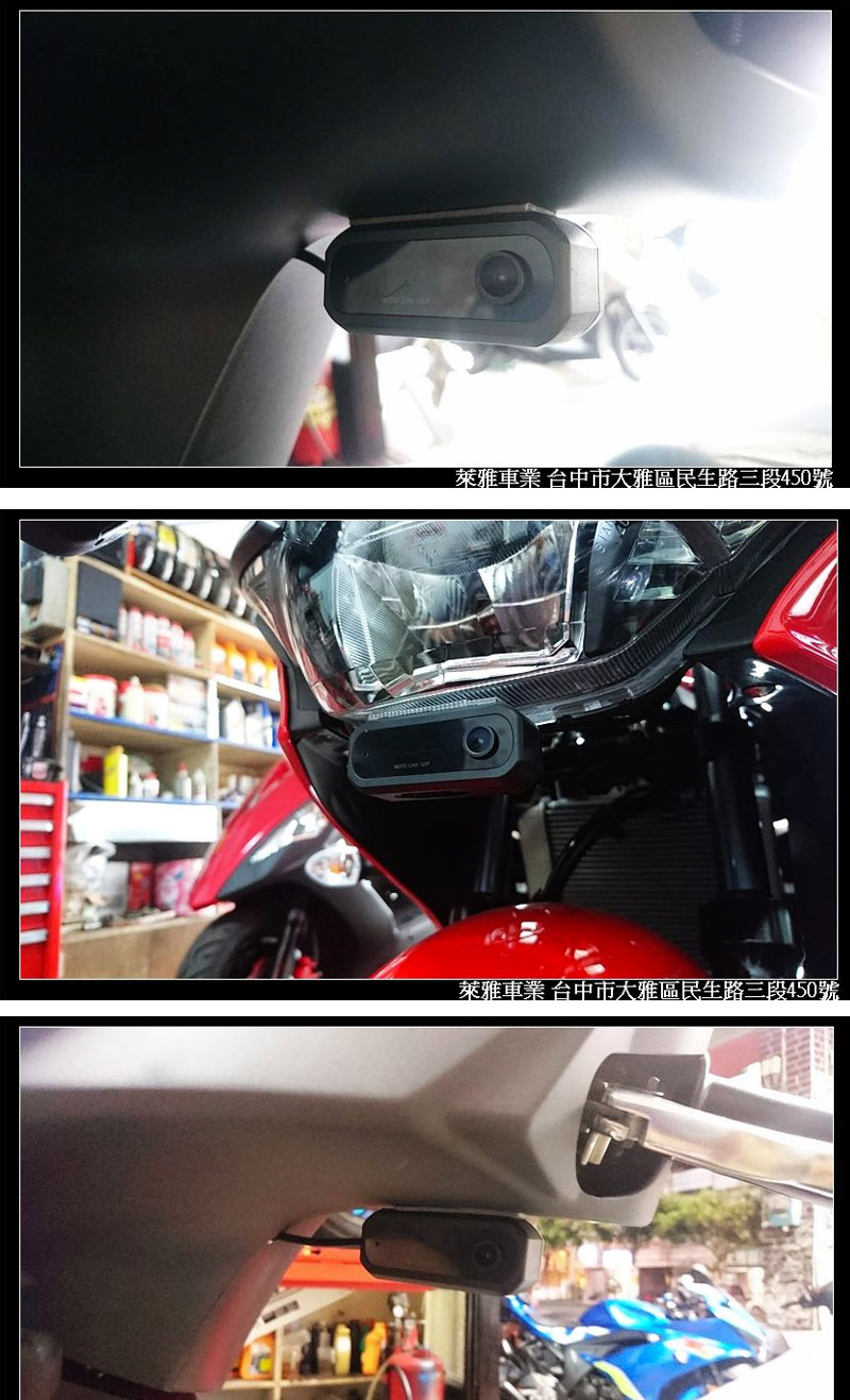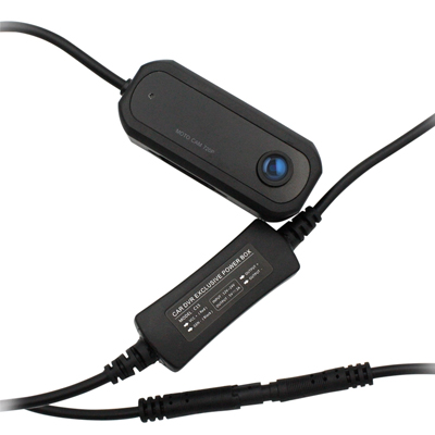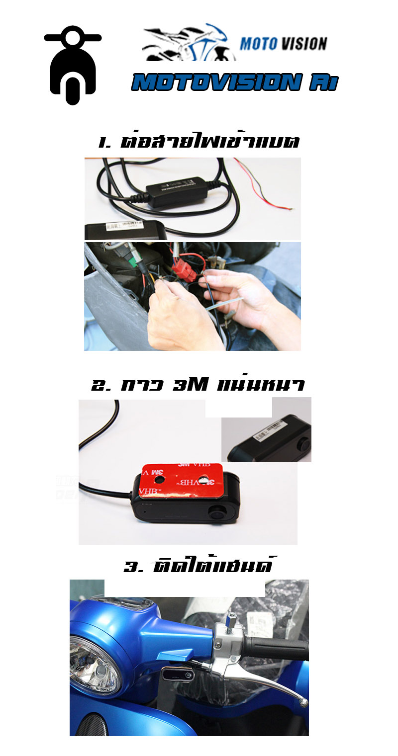 ตัวกล้องออกแบบมาให้ติดกับมอเตอร์ไซค์โดยเฉพาะ ต่อเข้าแบตและไฟเลี้ยง เริ่มถ่ายสตาร์ทรถ ไม่ต้องกดถ่าย