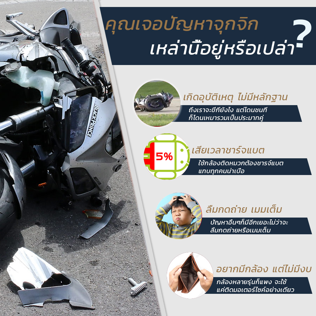 ป้องกันการชนแล้วหนี เก็บหลักฐานตลอดเวลา ช่วยคุณประหยัดทั้งเงิน ทั้งเวลา ด้วยกล้อง Motovision รุ่น A1 ไม่ต้องเถียงกับคู่กรณีอีกต่อไป ราคาไม่แพงใช้งานง่าย หายห่วง